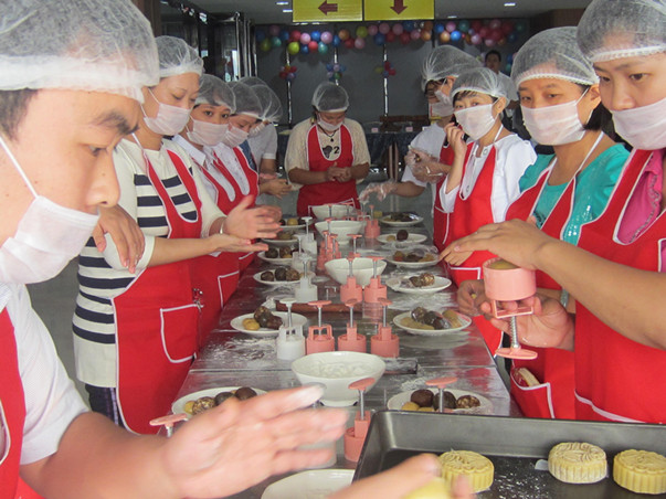 走进世博大厦服务中心,鲜花随处可见,华美的装修设计使人心旷神怡,现场充满了浓郁的节日氛围。大家热情高涨、十分投入,和面、擀皮,包馅,然后刷上蛋液,撒上芝麻,最后烘烤出炉。员工们边动手制作月饼边尽情享用自己的“完美作品”,并拍照留念,记录下了许多欢乐的瞬间。而现场专业的月饼师傅则耐心地传授制作月饼的要领,听得大伙频频点头。另外,除了可以亲手制作月饼,还可现场烘焙,让员工们可现场品尝至自己制作的月饼,活动现场处处洋溢着温馨和美的气氛……